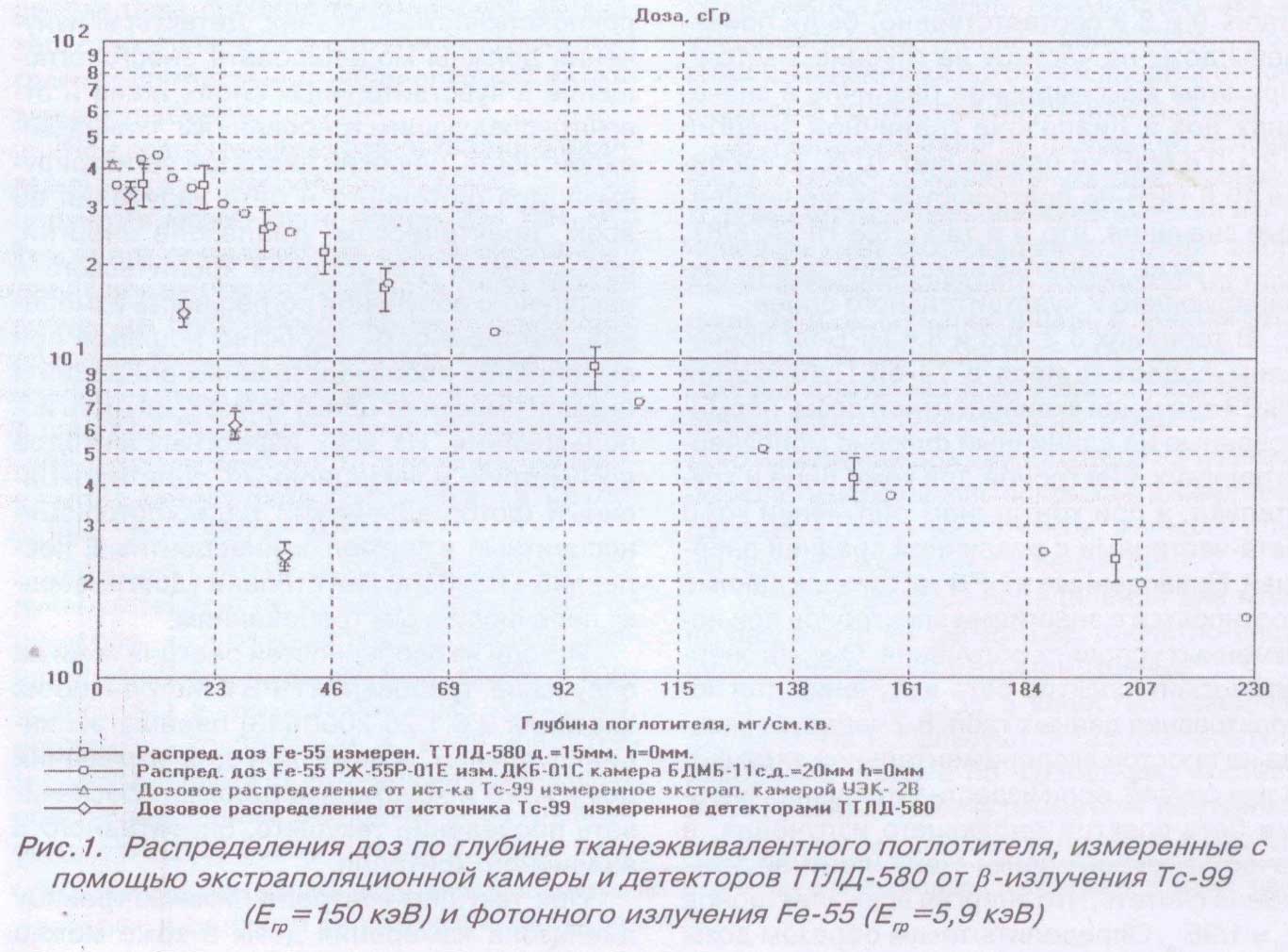 Для оценки корректности измерений дозовых распределений с помощью данных детекторов требовалось сопоставить результаты измерений с данными эталонной экстраполяционной камеры. На рис. 1 — 3 представлены результаты измерений дозовых распределений бета-излучения Тс-99 (Егр= 150 кэВ), TI-204 (Егр= 672 кэВ), Sr-90+Y-90 (Егр= 2270 кэВ) и фотонного излучения Fe-55 (Егр= 5,9 кэВ), полученных с помощью эталонной экстраполяционной камеры ЭК-2М из состава вторичного эталона единиц поглощенной дозы и мощности поглощенной дозы бета-излучения ВЭ-28 и детекторов ТТЛД-580 [4]. При построении дозовых распределений значение дозы соотносилось с серединой толщины детектора. Дозовые кривые в диапазоне граничных энергий бета-излучения 150 — 2270 кэВ и фотонного излучения с энергией 5,9 кэВ с погрешностью < 10 % совпадают, что свидетельствует о возможности измерения доз на различной глубине детекторами ТТЛД-580 вне зависимости от граничной энергии бета-излучения.