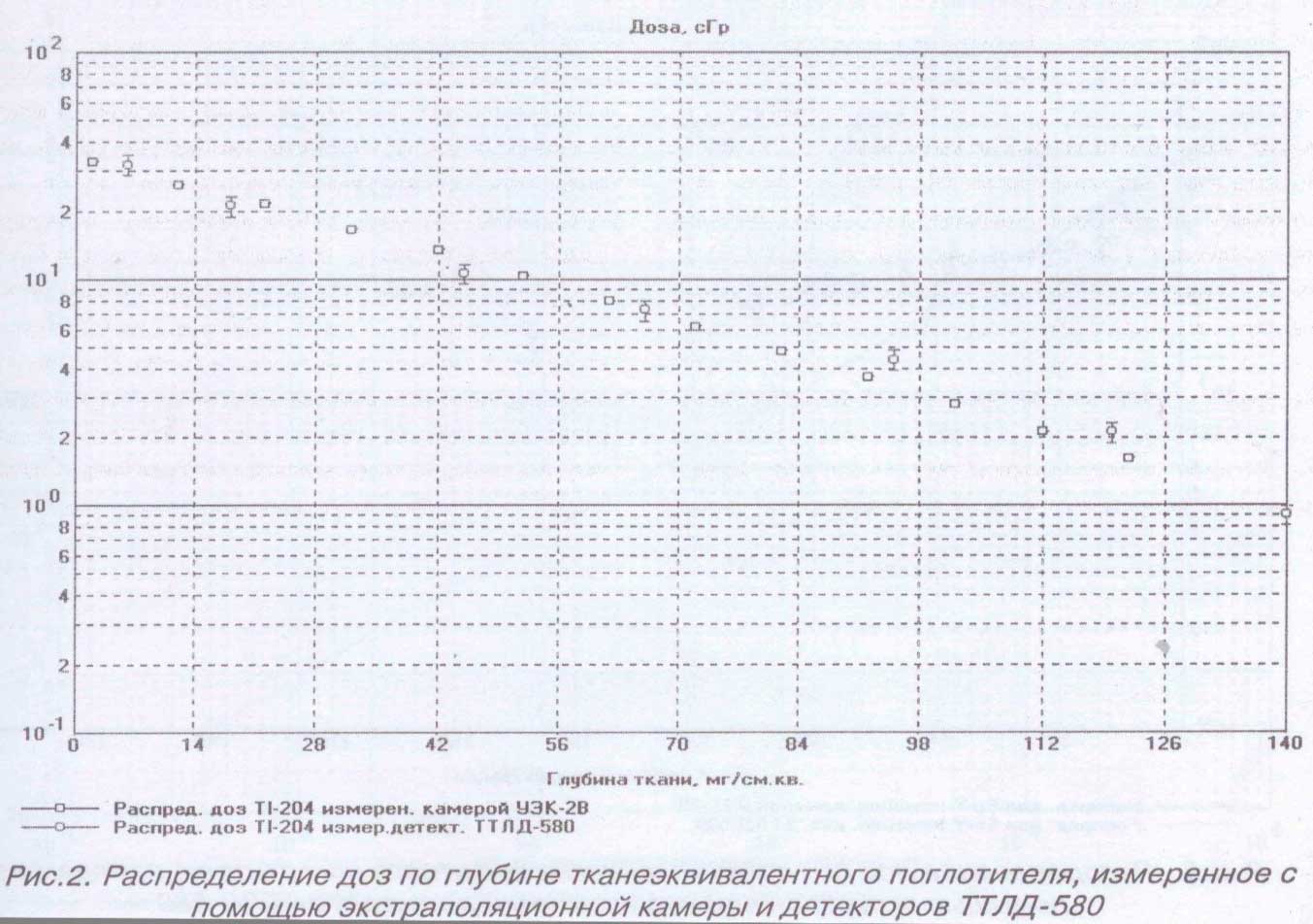 Рис. 2. Распределение доз по глубине тканеэквивалентного поглотителя, измеренное с помощью экстраполяционной камеры и детекторов ТТЛД-580 от бета-излучения TI-204
