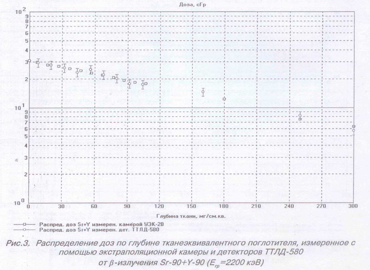 Анализ глубинных дозовых распределений бета-излучения в тканеэквивалентном материале в диапазоне граничных энергий Егр =150 - 2200 кэВ, полученных с помощью эталонной экстраполяционной камеры, свидетельствует о том, что с погрешностью < 7 % распределение дозы в слое 10 мг/см2 может быть аппроксимировано прямой даже при Егр=150 кэВ. Таким образом, среднее значение дозы в слое 10 мг/см2 будет соотноситься с серединой толщины детектора, т.е. с глубиной 5 мг/см2. При толщине входного окна 2 мг/см2 значение измеренной дозы первым детектором соотносится с глубиной 7 мг/см2, что практически не отличается от нормативной величины в слое 5 мг/см2 за экранирующем слоем 5 мг/см2.