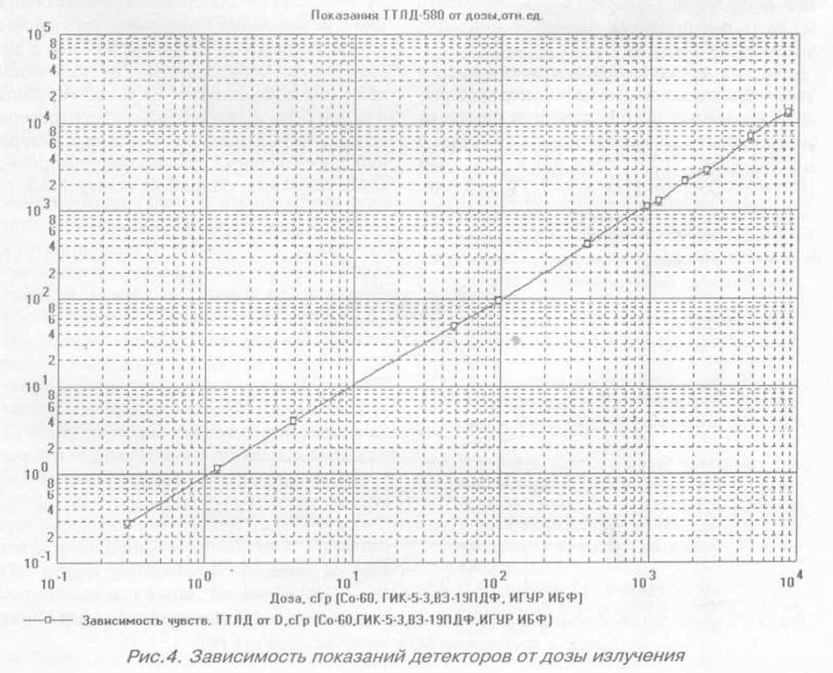 На рис. 4 представлена зависимость показаний детекторов от дозы излучения в диапазоне 2·10-3 - 9·101 Гр. Видно, что в указанных пределах эта зависимость может быть аппроксимирована степенной функцией, т.е. возможен её учёт процессором считывающей аппаратуры.