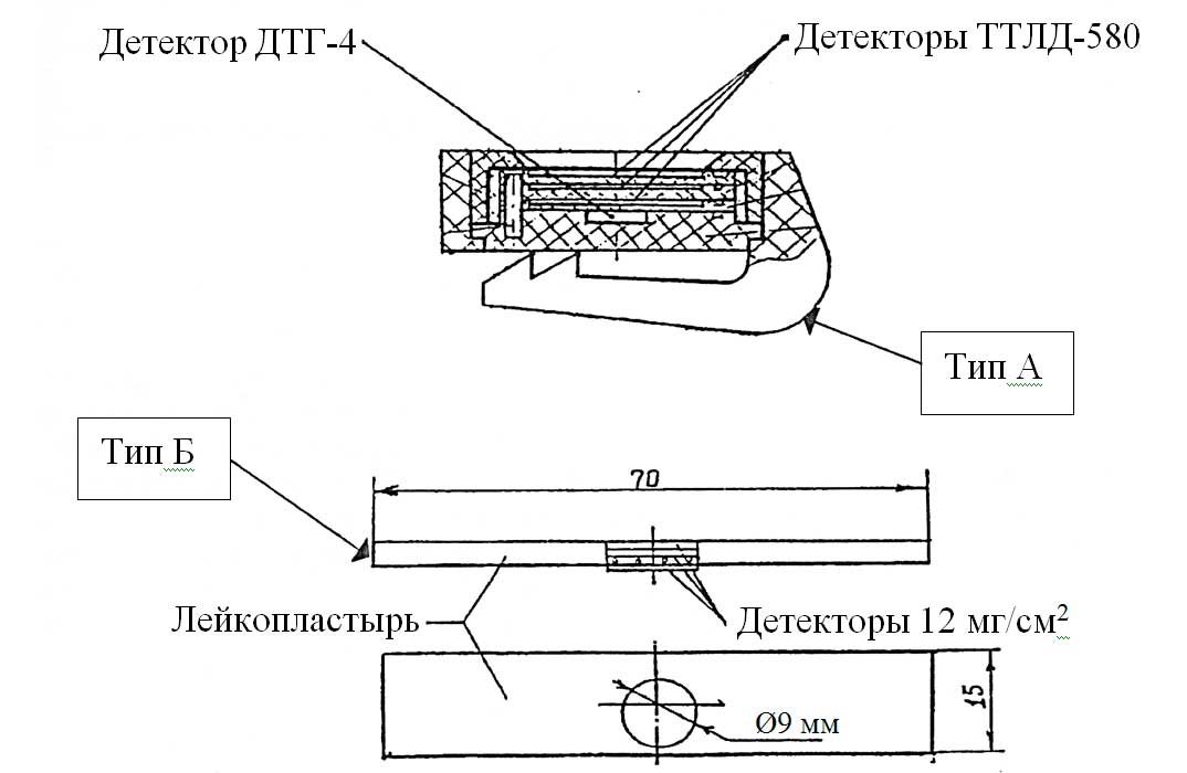На рис. 5 представлено устройство индивидуальных дозиметров для измерения эквивалентных доз в коже лица и хрусталике (А), а также для измерения доз в коже пальцев рук (Б), апробированных на производственных технологических участках.