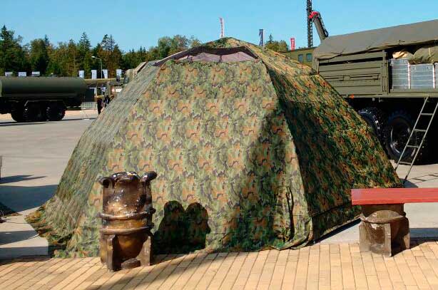 Палатка содержит каркас, на который натянуто полотно тента. Механизм раскрытия каркаса позволяет легко раскрывать палатку одному человеку всего за несколько минут. В состав палатки входят: комплект штырей для растяжки и закрепления на почве, термоподстежка и пол. Вес палатки в сложенном состоянии от 10 до 25 кг в зависимости от размеров. Ткань - по желанию Заказчика. По вместимости (размерам) палатки могут быть от 2-х до 8-ми местных. Производство построено по принципу «под заказ».