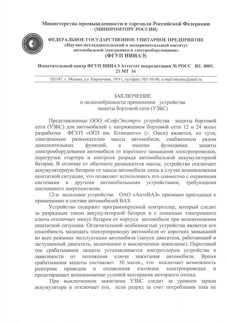 Устройство Защиты Бортовой Сети (УЗБС) осуществляет защитные функции во всех режимах эксплуатации автомобиля (выключенное зажигание; включенное зажигание; режим пуска двигателя работающий двигатель, заглушенный двигатель).